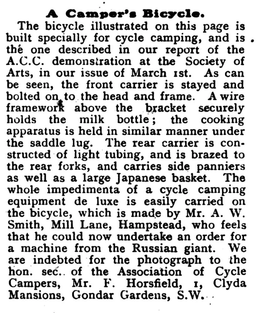 In an article from the 22 Mar 1905 edition of “Cycling” a camper’s cycle is described. Although the picture is poor quality, I couldn’t find a better one, we can easily see the front and rear racks, it looks remarkably similar to a modern touring bike.