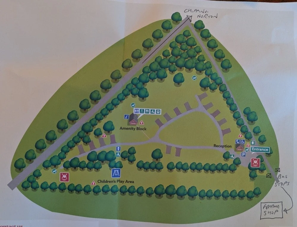 It's a small site but up to the usual Club standards, with excellent facilities and very friendly staff. I have attached a scan of the site plan and added the direction to Chipping Norton, the bus stops and also the farm shop next door. I didn’t have time to see much but I discovered later that the farm shop is owned by Jeremy Clarkson!